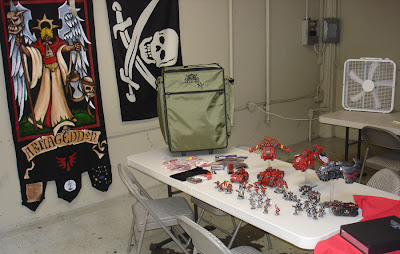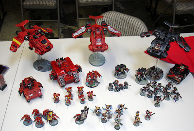 John and I were finally able to finish up our part of the Heroes of Armageddon Charity Drive. The winner of the Blood Angels army, Peter Dean, lives in Oakland and we agreed to meet halfway between Santa Cruz and Oakland: GameKastle in San Jose (the BEST game store in the Bay Area I think). Anyway, we were kindly allowed to set up the entire army and await Peter. Here is another quick overview: