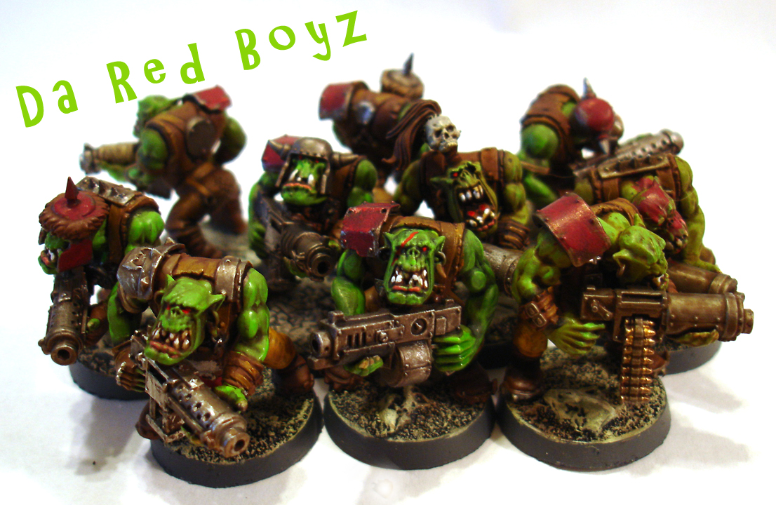 Mike and I are plugging away on the Ork Goff army, and it is coming together beautifully. We have many talented and hardworking painters involved and also some new and young talent: Mike's whole family has been pitching in to get ork boys painted, including some basecoat painting by his daughters at 10 cts a model..generous!