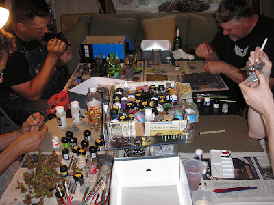 The Santa Cruz Warhammer Game Night group came together last friday for about 5 hours and helped John and I painting the 4th army for the Heroes of Armageddon. We made lots of progress and one of the things that made a huge difference was the painting of 100 bases by Glenn and Tony. Here's a shot of that evening.